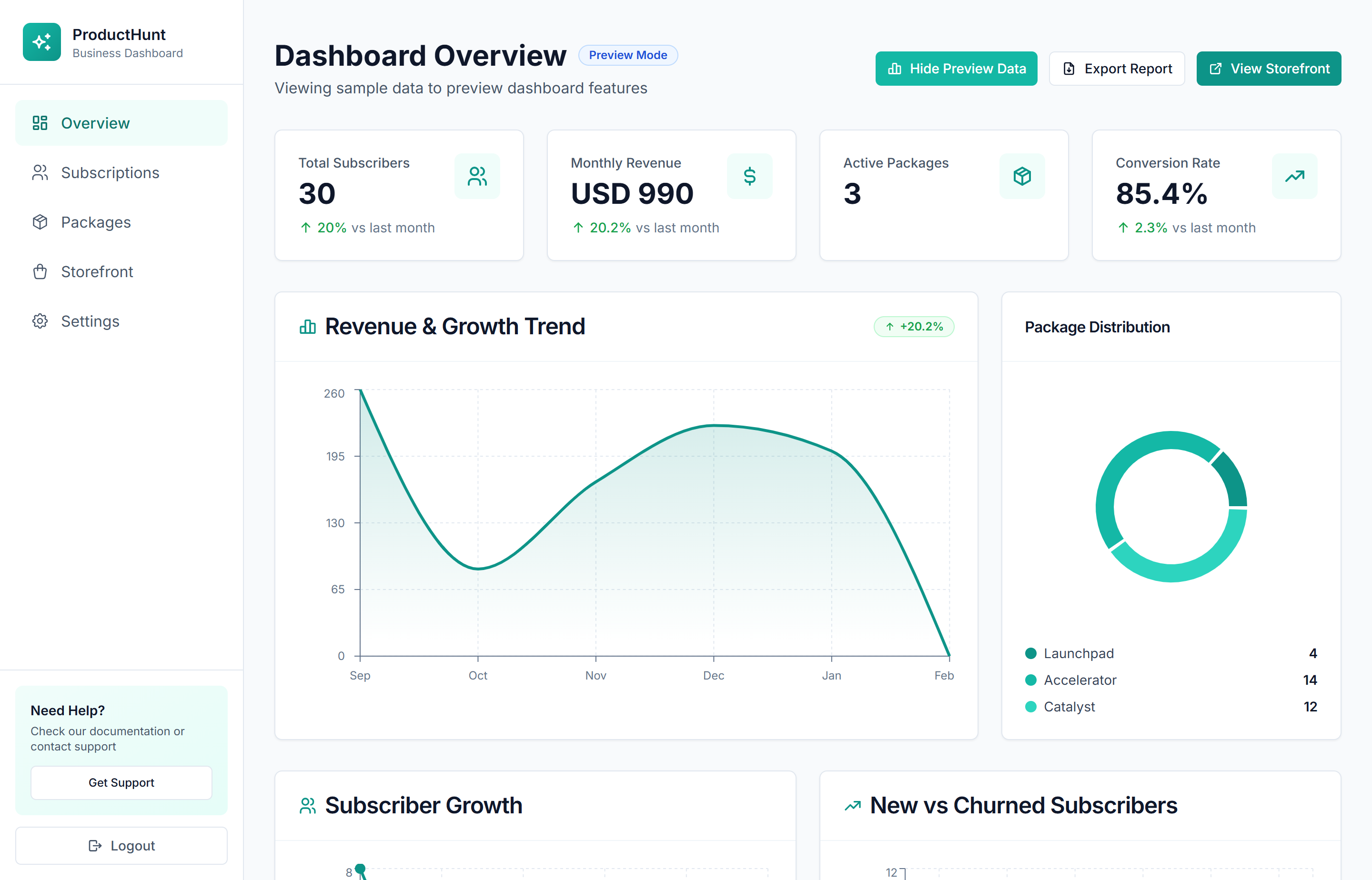 Track your packages, subscribers, revenue, and storefront performance from one clean, intuitive dashboard.